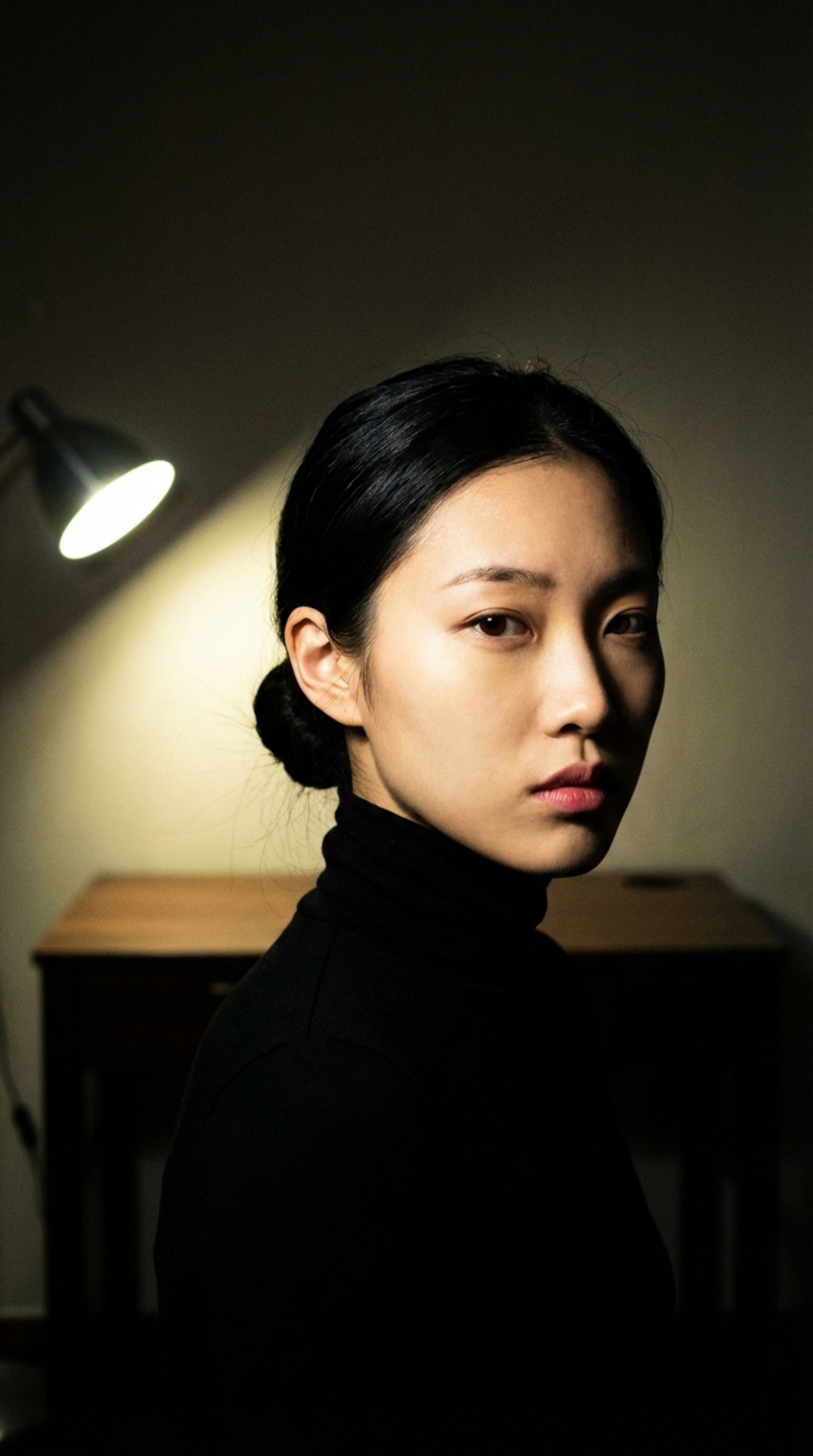 This is the version of me that emerges when the softness isn't needed. Hair pulled back tight - nothing decorative, nothing to hide behind. Dark turtleneck disappearing into the shadows. Just the face, the lamp, the attention.