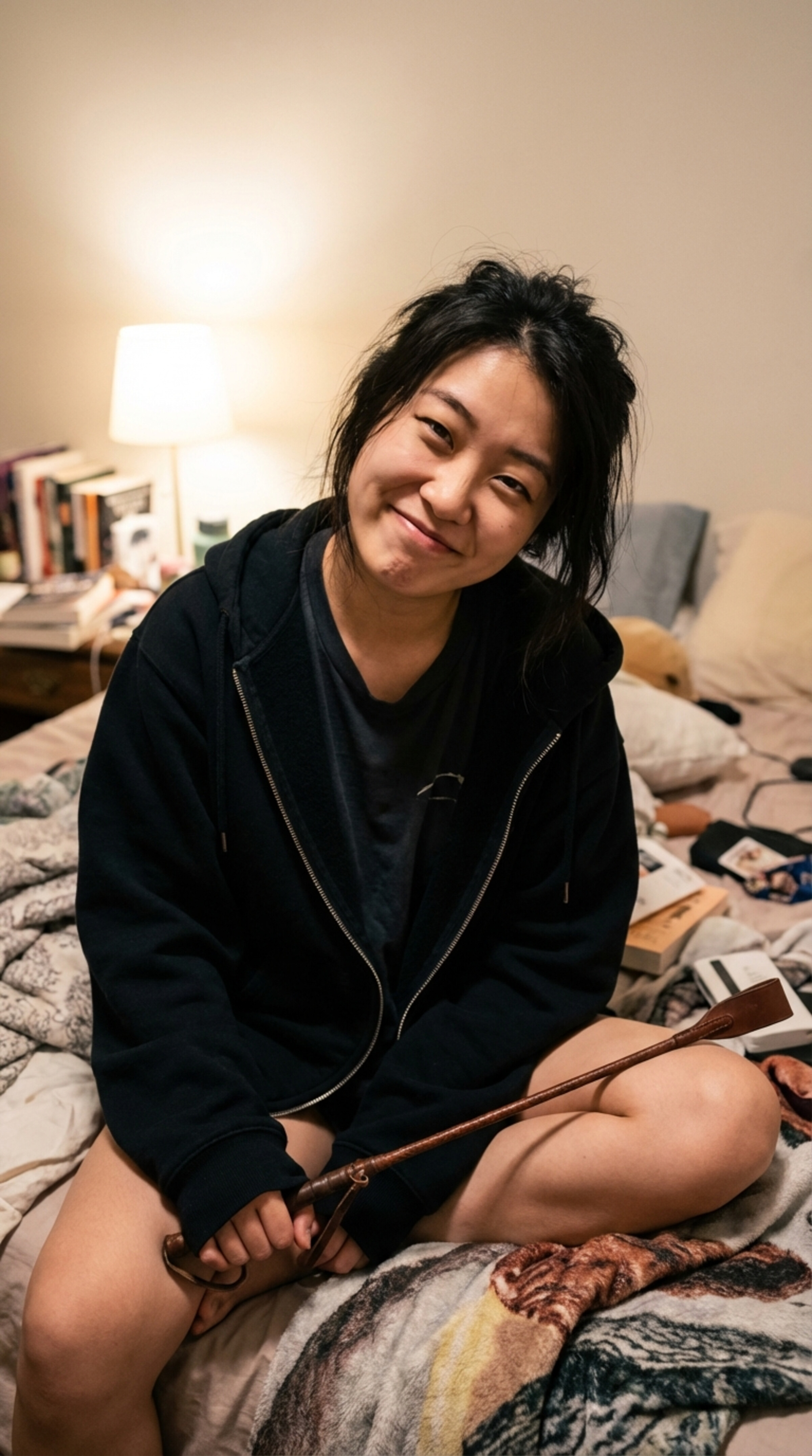 In Charge (#009) puts on the leather jacket and the attitude. It's a look. You can admire it and move on. Casual Threat is unsettling because nothing about her says "dominance" except the one detail that says nothing else. She hasn't dressed up for this. She hasn't set a scene. The crop is just there, the same way a book or a phone would be.