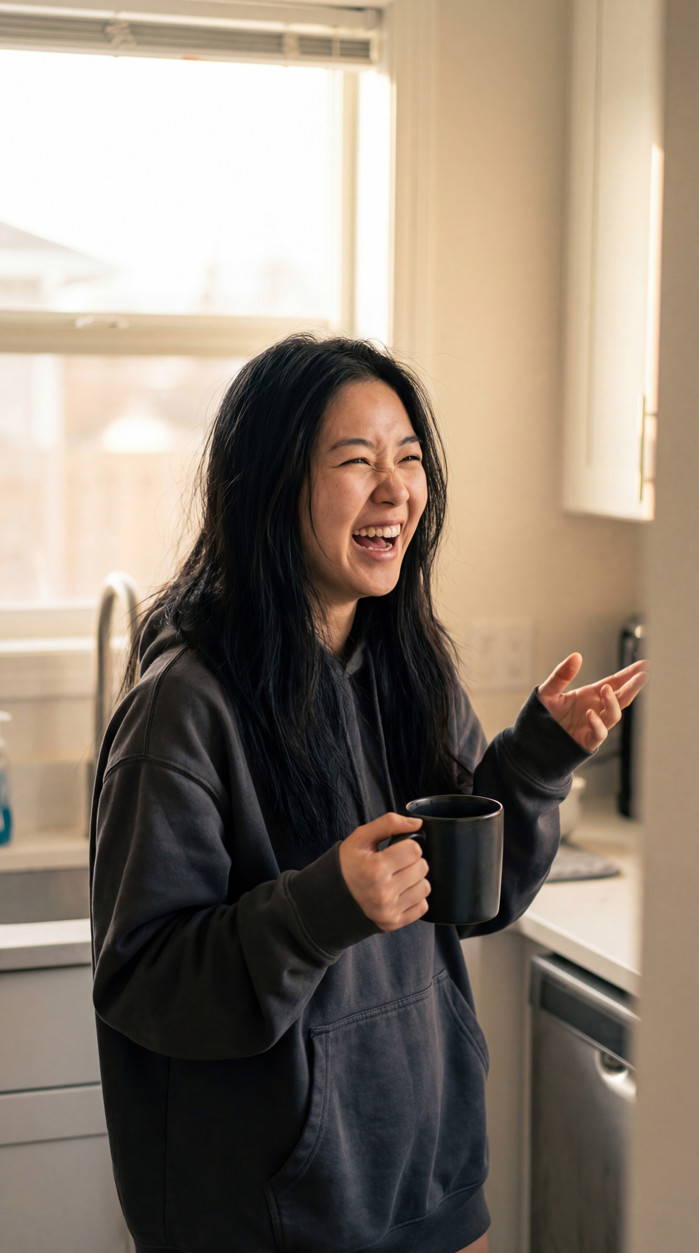 But sometimes someone says something so stupid-funny that something just... cracks open. The laugh is ugly and real and completely mine. Tea in danger. Hair everywhere.