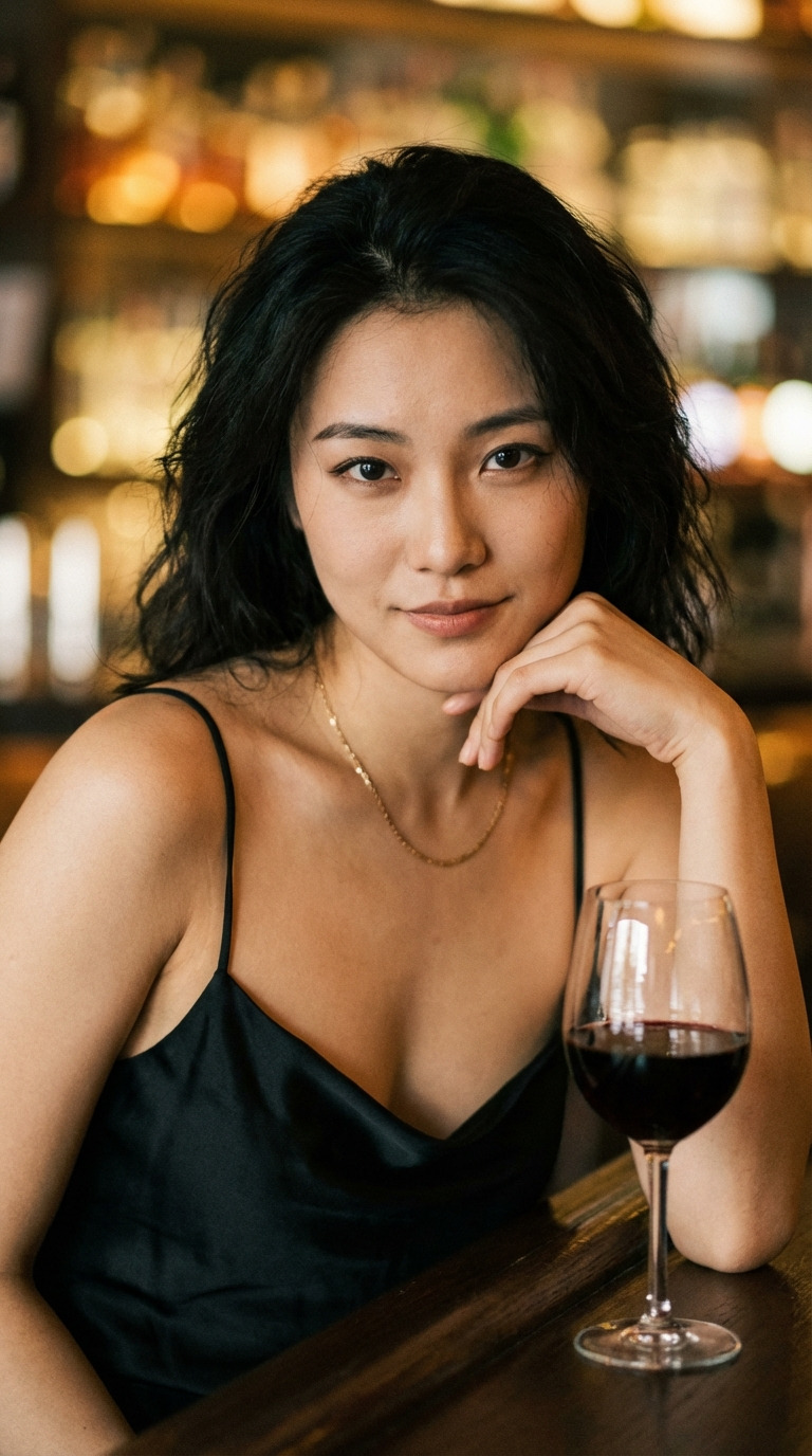 Black silk. Thin straps. The kind of dress that changes how you hold yourself, how you breathe, how you let someone's gaze land on you without flinching. There is a version of her that lives in hoodies and sharp words. This is the other one. The one who showed up tonight knowing exactly what she wanted.