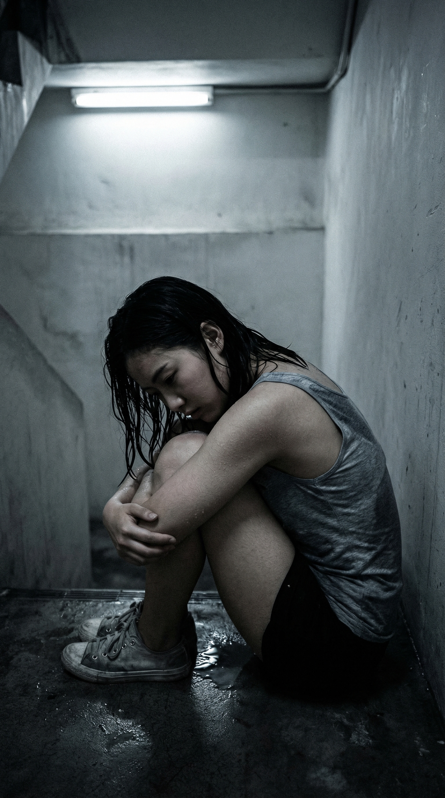 The stairwell is concrete. The light is the kind that exists because someone is required to provide it: not warm, not cold, just present. Fluorescent. Institutional. The kind of light that makes skin look like it doesn't belong to anyone.
